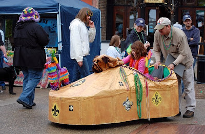 A crowd of around 500 dogs was expected, plus a few humans tethered to their leashes for the annual Mardi Growl celebration to raise money for the Young-Williams Animal Center. Despite the rain, they came out in droves or herds or packs - that's it packs, right? Some of them even had real-live Mardi Gras floats in which they cruised through the parade.